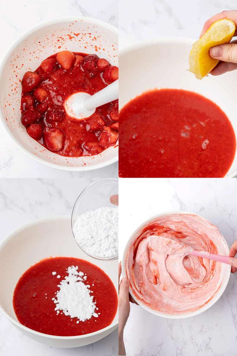 مرحله دوم: ترکیب با طعم دهنده ها آب لیموی تازه و پودر قند الک شده را به پوره توت فرنگی اضافه و خوب مخلوط کنید. بعد از اینکه کاملاً ترکیب شدند، آن را بچشید و اگر لازم بود، کمی پودر قند دیگر اضافه کنید.