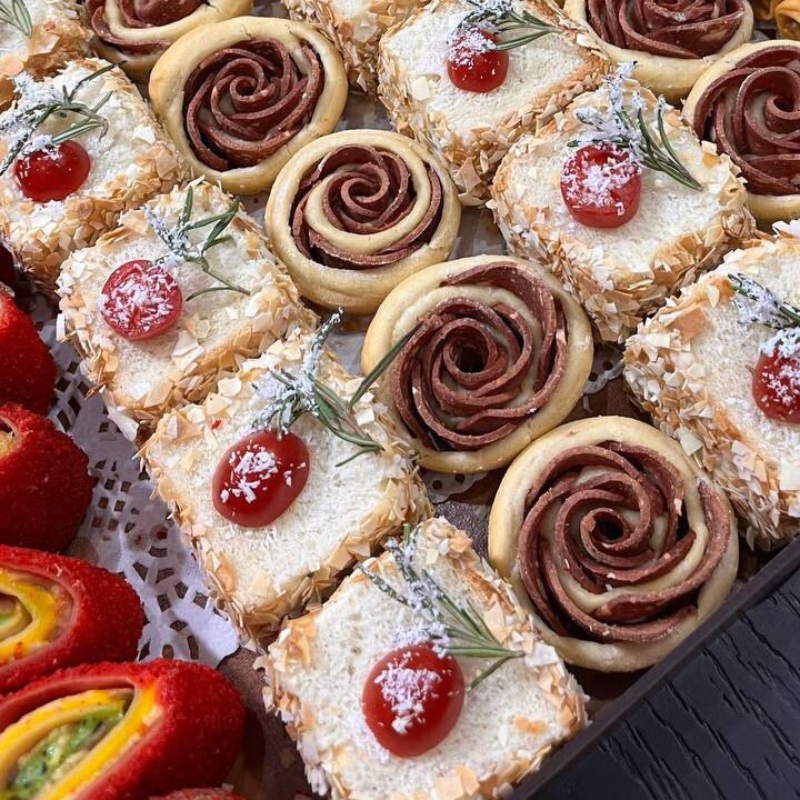تمام آیتم ها با دقت بالا تهیه و با دیزاین حرفه ای شامل گوجه گیلاسی، پودر نارگیل، برگ رزماری و نان های قالبی تزئین شده اند.