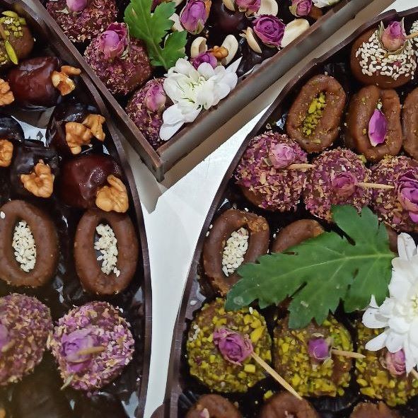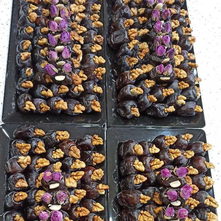 خرمای هسته گیری شده، با مغزی گردوی اعلا و روکشی براق، در سینی های مجلسی کنار پرک بادام و غنچه های گل محمدی چیده شده است. نتیجه؟ پک پذیرایی آماده و شیک که بدون دردسر مستقیماً روی میزِ مراسم می نشیند.