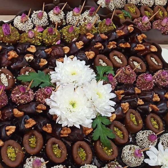 ترکیب: حلوا زعفرانی + خرمای مغزدار گردو (نسبت دقیق قابل هماهنگی)